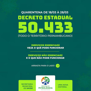 Conforme o decreto publicado pelo Governo do Estado, todo o território de Pernambuco entrará em quarentena do dia 18/03 à 28/03, podendo ser aberto somente serviços essenciais.
